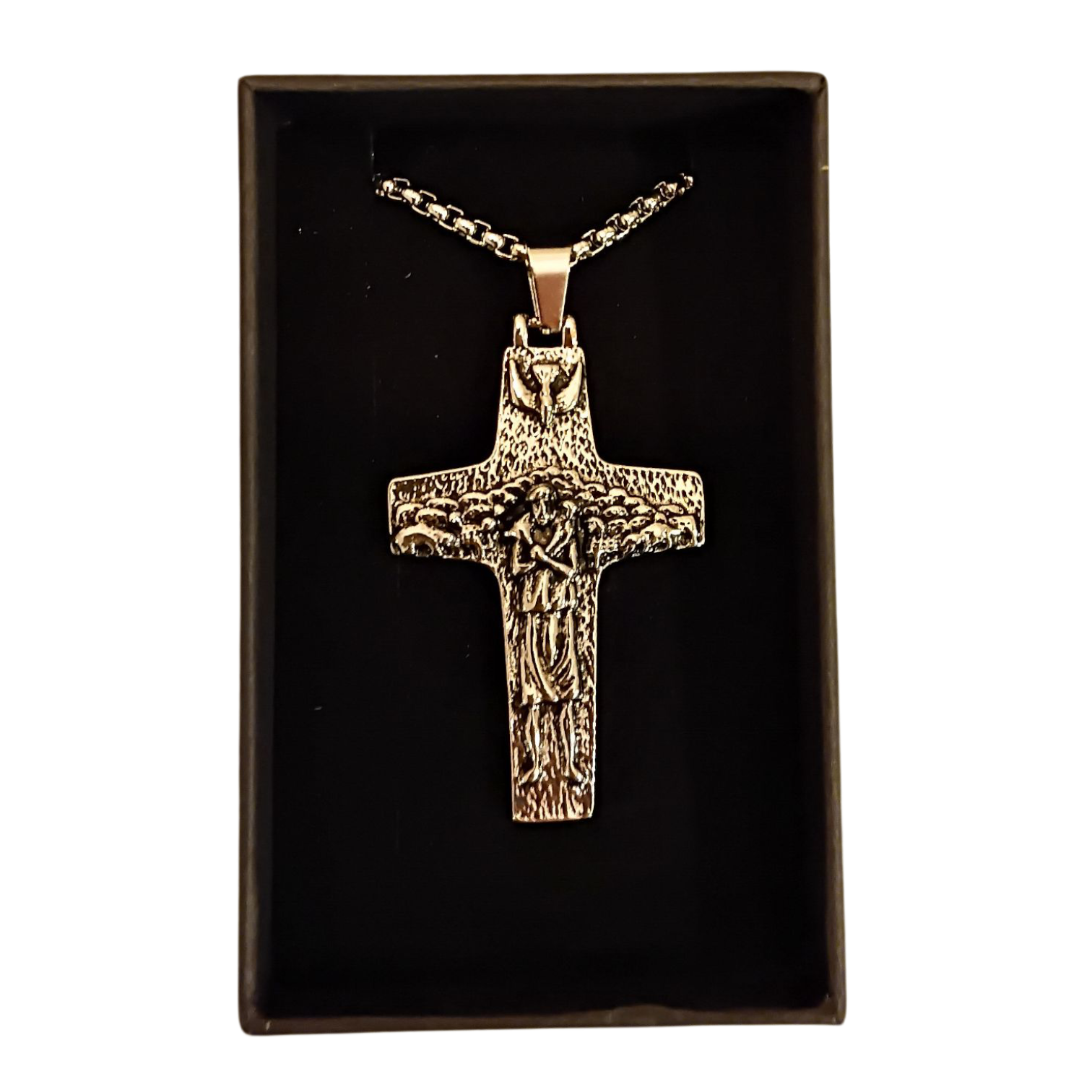 4cm Zinc Alloy Cross on a 30cm chain. This cross represents the Good Shepherd which leads the flock to the sheep pen with the lost sheep on his shoulders. Often called "Pope Francis' Cross", this design was chosen and worn by the late Pope Francis.