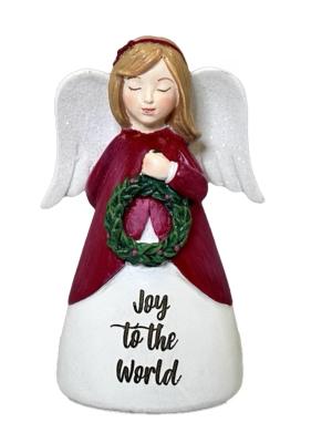This coloured resin angel is holding a small Christmas wreath and is accented with glittering wings and intricate detailing.