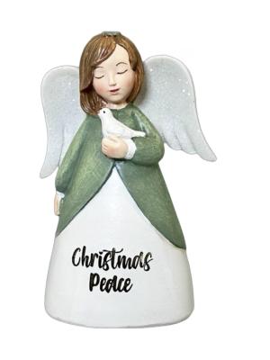 This coloured resin angel is holding a small white dove and is accented with glittering wings and intricate detailing.