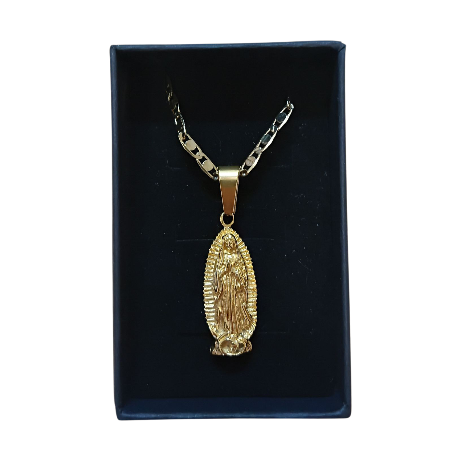 3cm gold plated medallion of Our Lady of Guadalupe connected to a 60cm gold plated chain.