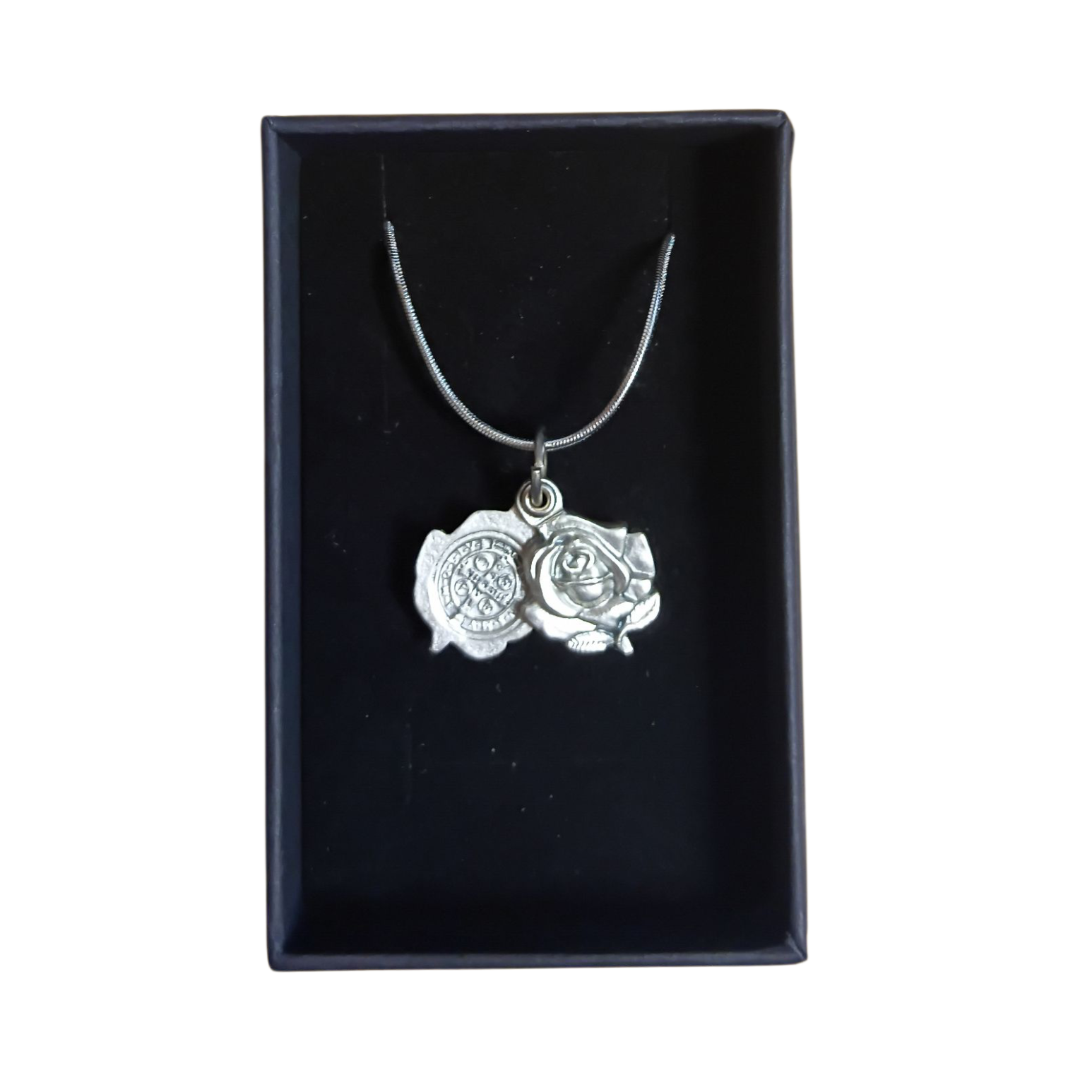 Rosebud pendant with St Benedicts Medal in the middle. Comes with a 45cm or 60cm Silver chain.