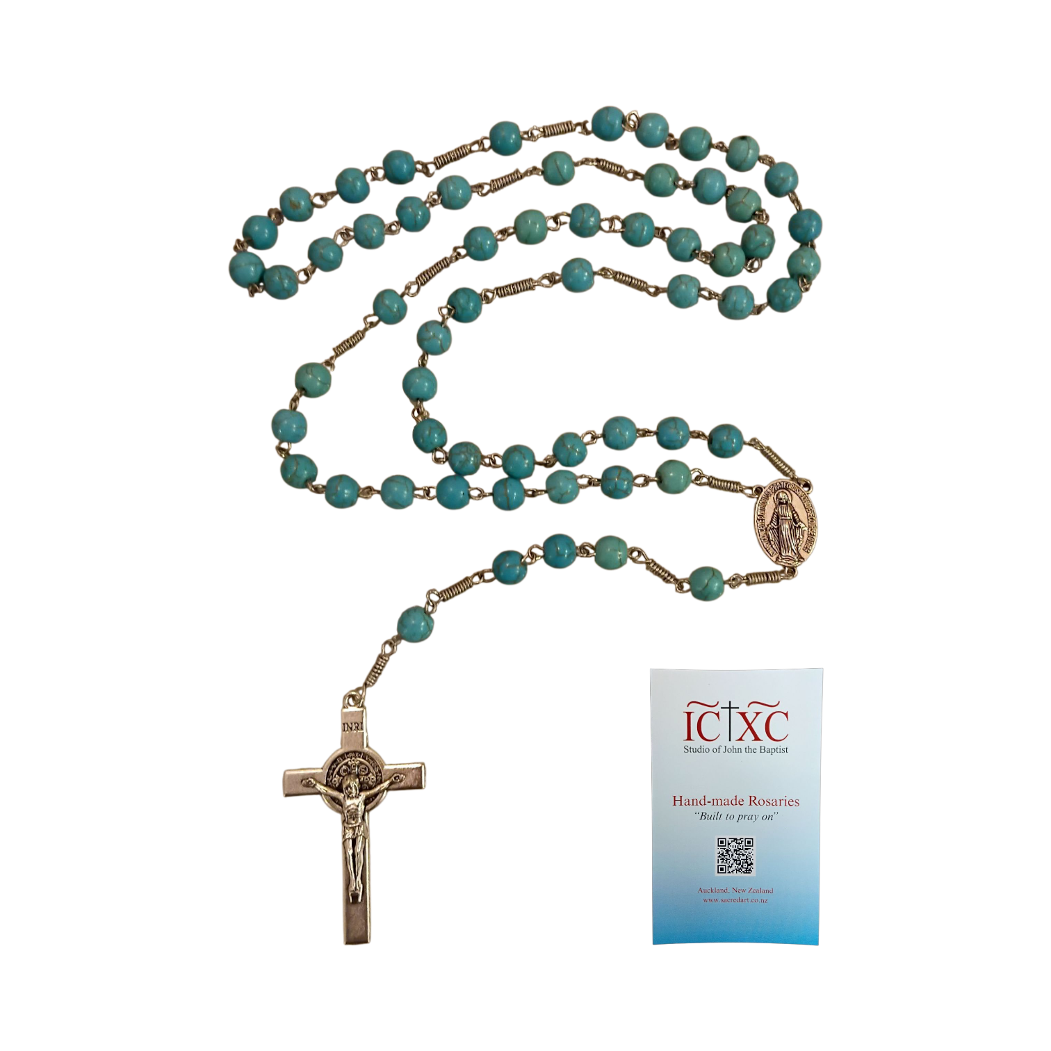 Strong durable rosary made with tinned-copper anti-rust wire, aqua stone-like beads, miraculous medal centre piece, and a St Benedict metal crucifix.