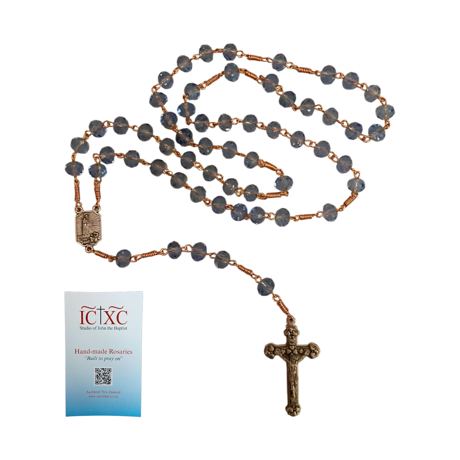 Strong durable rosary made with tinned-copper anti-rust wire, translucent light blue glass beads, Fatima medal centre piece, and a metal crucifix.