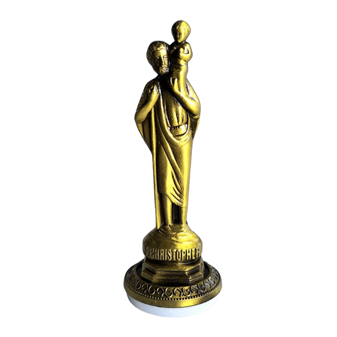 9cm small gold finished statue of St Christopher, Patron Saint of Travellers.