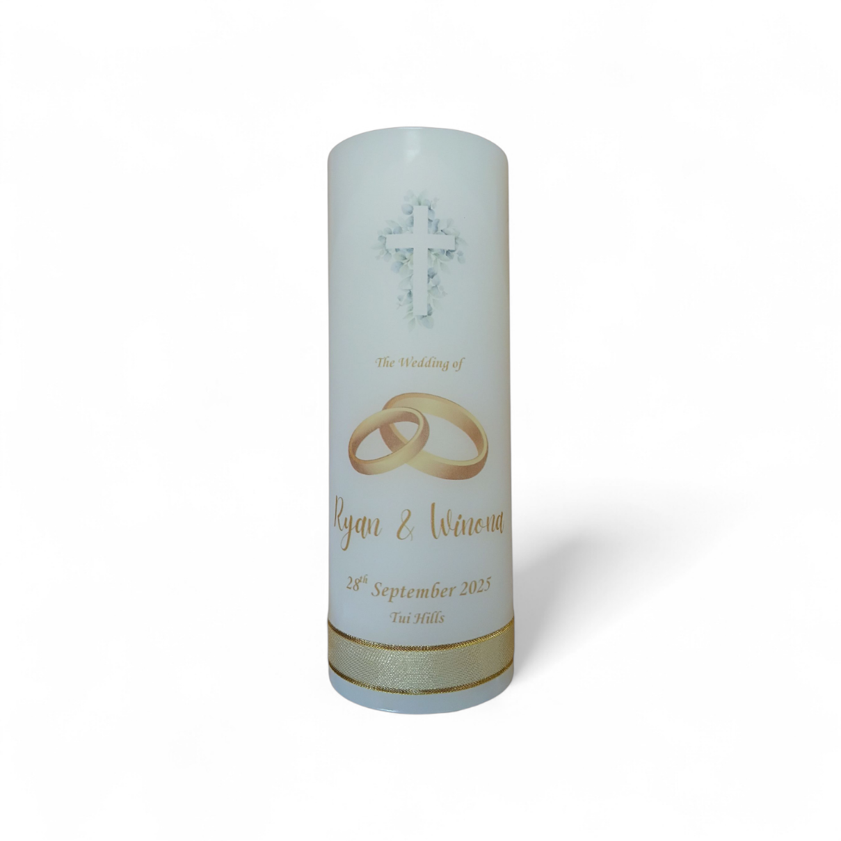 Celebrate your special wedding day with this elegant White Festival Personalised Wedding Candle, beautifully crafted in New Zealand. Measuring 19cm x 7cm, this premium wedding candle features one of our refined new designs, perfect for Christian and Catholic wedding ceremonies.